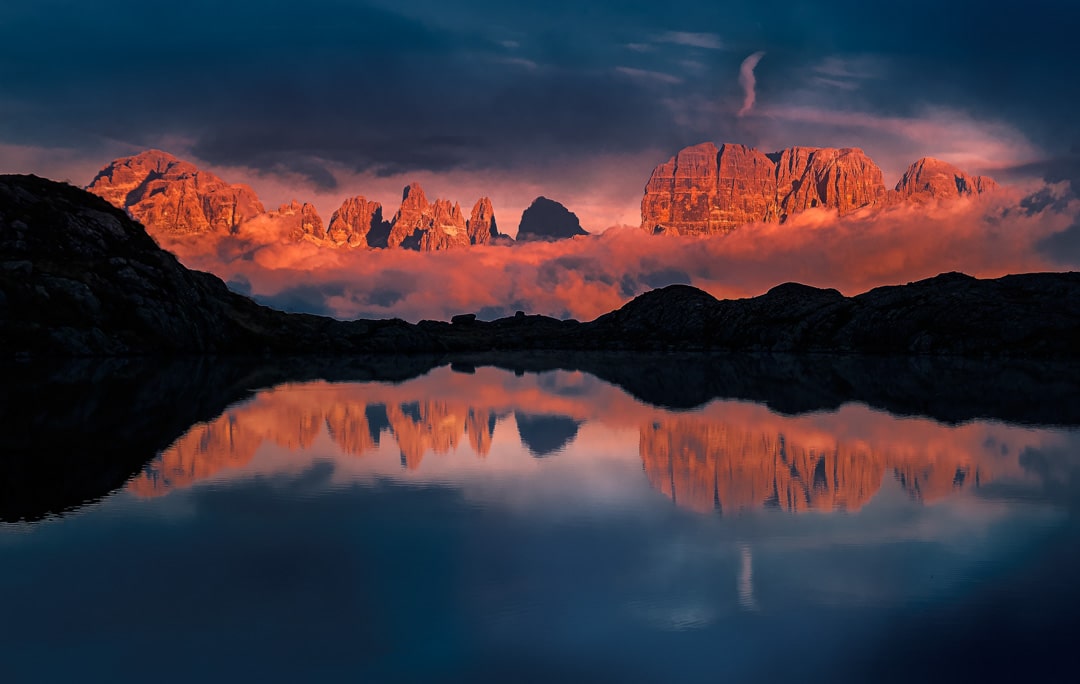 In the photo: From the shore of Lago di Nero, the Brenta lights up in the evening haze, mirrored so clearly it’s hard to tell where the mountains end and the lake begins.